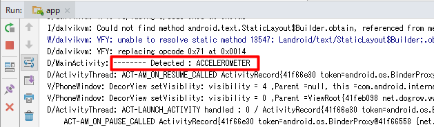 センサーを見つけたら、Android Studioのログ画面に表示するだけ。