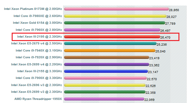 この CPUの PASSMARKのベンチマークテスト結果を見ると、同じく18コアの Core-i9 7960Xに近いスコアが出ている。