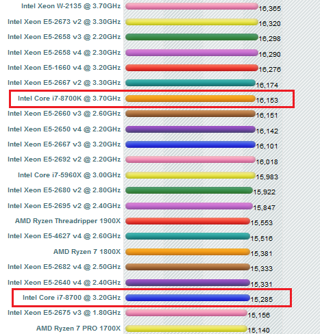 ちなみに現在の一般向けパソコン最上位機種に搭載されている CPU(Core-i7 8700K, 8700)の同テスト結果はこれぐらい。