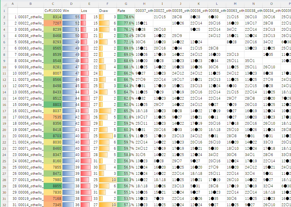 全試合の結果をプログラムで CSVファイル出力させ、それを Excel上で色付けしてみた。